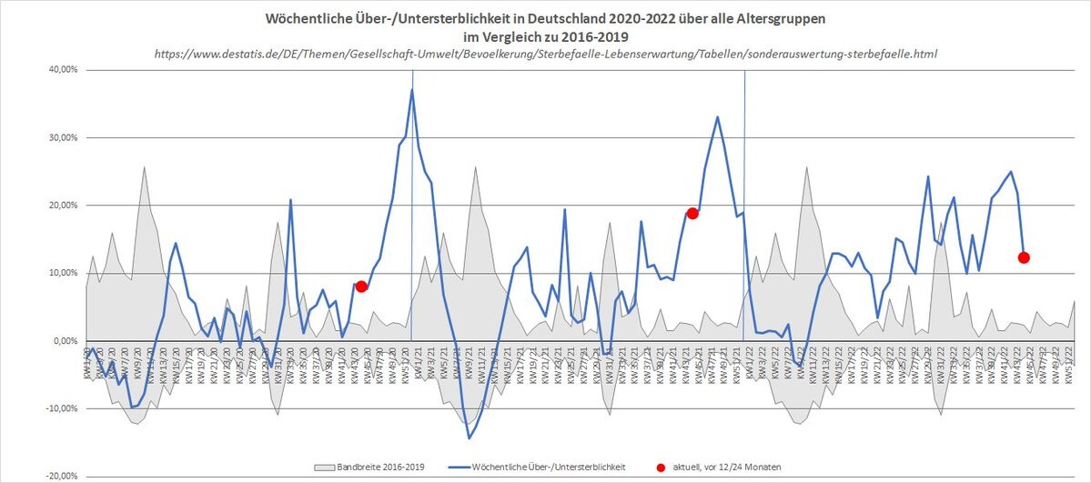 #Übersterblichkeit in Deutschland in der Kalenderwoche 44/2022 (31.10.2022 bis 06.11.2022) gegenüber 2016-2019: 12,4% (304 zusätzliche Sterbefälle pro Tag)