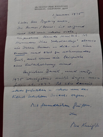 It's a note to a reader from Max Knight, who translated Christian Morgenstern's "Galgenlieder." I can make out a few of the easier words like "Herzlichen Dank" (Heartfelt thanks) and "Lieber Herr mystery man" (Dear Mr. ...etc) and something about hoping 1975 won't be as bad as 1974, but I don't understand the rest. #Deutsche #Übersetzen