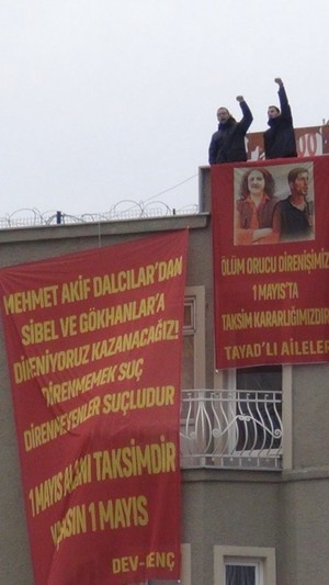 Από την πλατεία Ταξίμ σήμερα. Το AKP απαγόρευσε κάθε εορτασμό Πρωτομαγιάς, αλλά επαναστάτες έχουν κρεμάσει δύο πανό σε ένα κτίριο στην πλατεία.