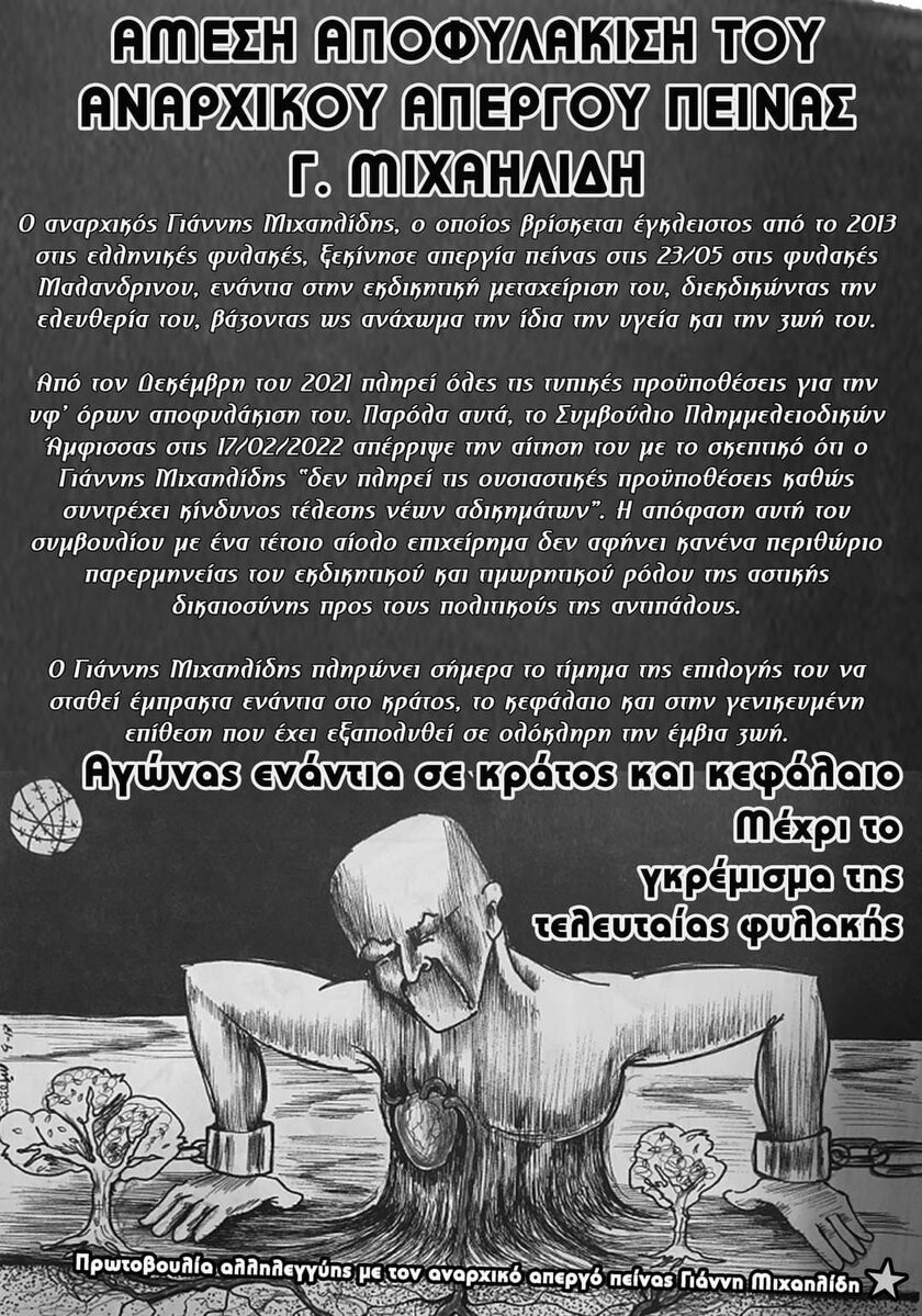 Άμεση απελευθέρωση του αναρχικού απεργού πείνας Γ.Μιχαηλίδη