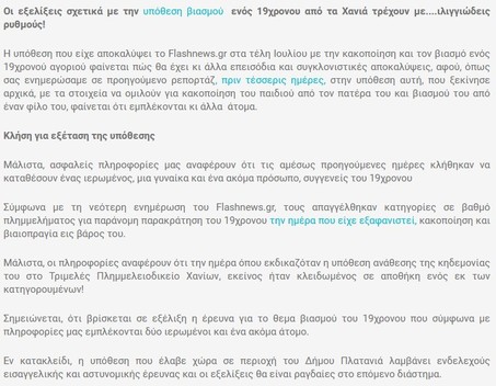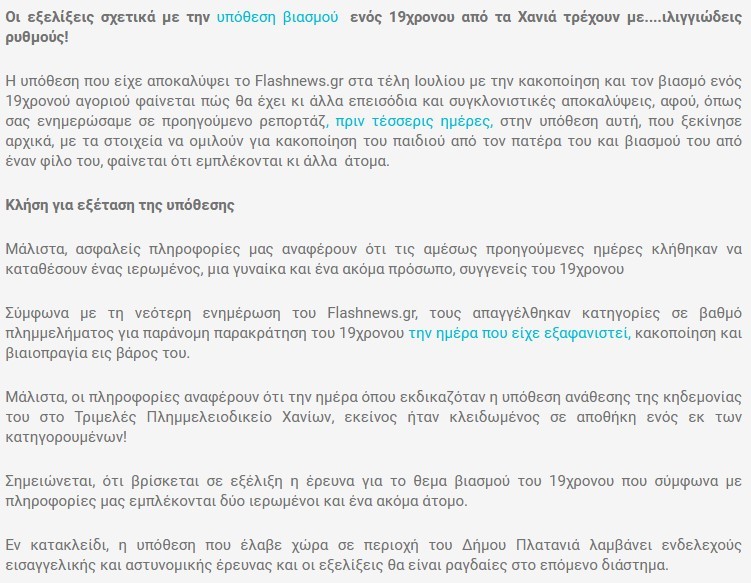 Την Κυριακή 31/8 , ο Δημήτρης Κοπανάκης, επιχειρηματίας, συνιδιοκτήτης του Canva bar και ιδιοκτήτης των Evlimeni suites, βιάζει 19χρονη στην παραλία Φαλάσαρνα Χανίων.