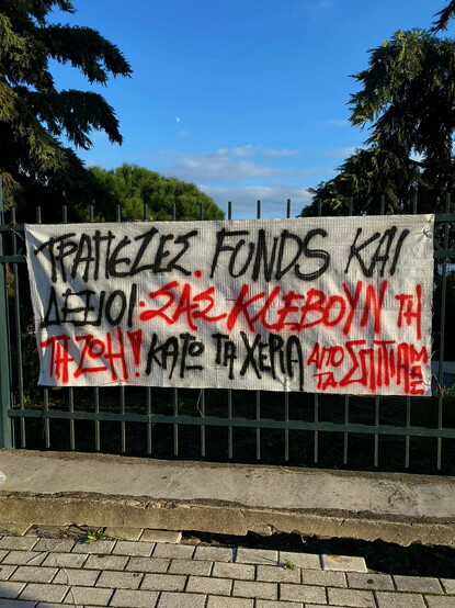 Πανό στο πάρκο Φαλήρου 2/12/2022 : ΤΡΑΠΕΖΕΣ FUNDS & ΔΕΞΙΟΙ ΣΑΣ ΚΛΕΒΟΥΝ ΤΗ ΖΩΗ - ΚΑΤΩ ΤΑ ΧΕΡΙΑ ΑΠΟ ΤΑ ΣΠΙΤΙΑ ΜΑΣ