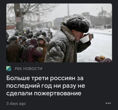 А я бы дал заглавие: две трети россиян за последний год сделали пожертвование по крайней мере один раз. #сми #воздействие