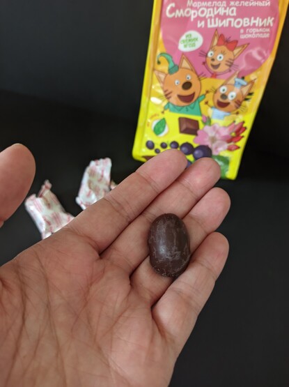 Мармелад желейный Три Кота. Состав по вегану. Стоит в районе 130р. Мне не понравился. Оболочка из горького шоколада, а внутри мармеладка. И вот вкус довольно странный как по мне. Ну и считаю, что 130р для этой нямки дороговато.