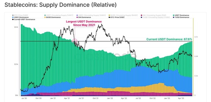 USDT продолжает наращивать долю рынка среди остальных стейлкоинов. На данный момент доминирование USDT на рынке оценивается в 67.6% —- Glassnode