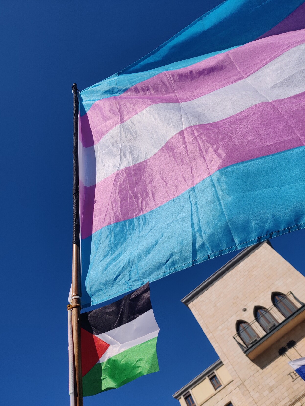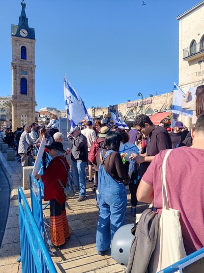 כיכר השעון הבוקר: יותר אנשים מהשבוע שעבר, פחות דגלי ישראל (לפחות יחסית לכמות האנשים, אם לא אבסולוטית), יותר דגלי פלסטין, ו- @eyal אחד