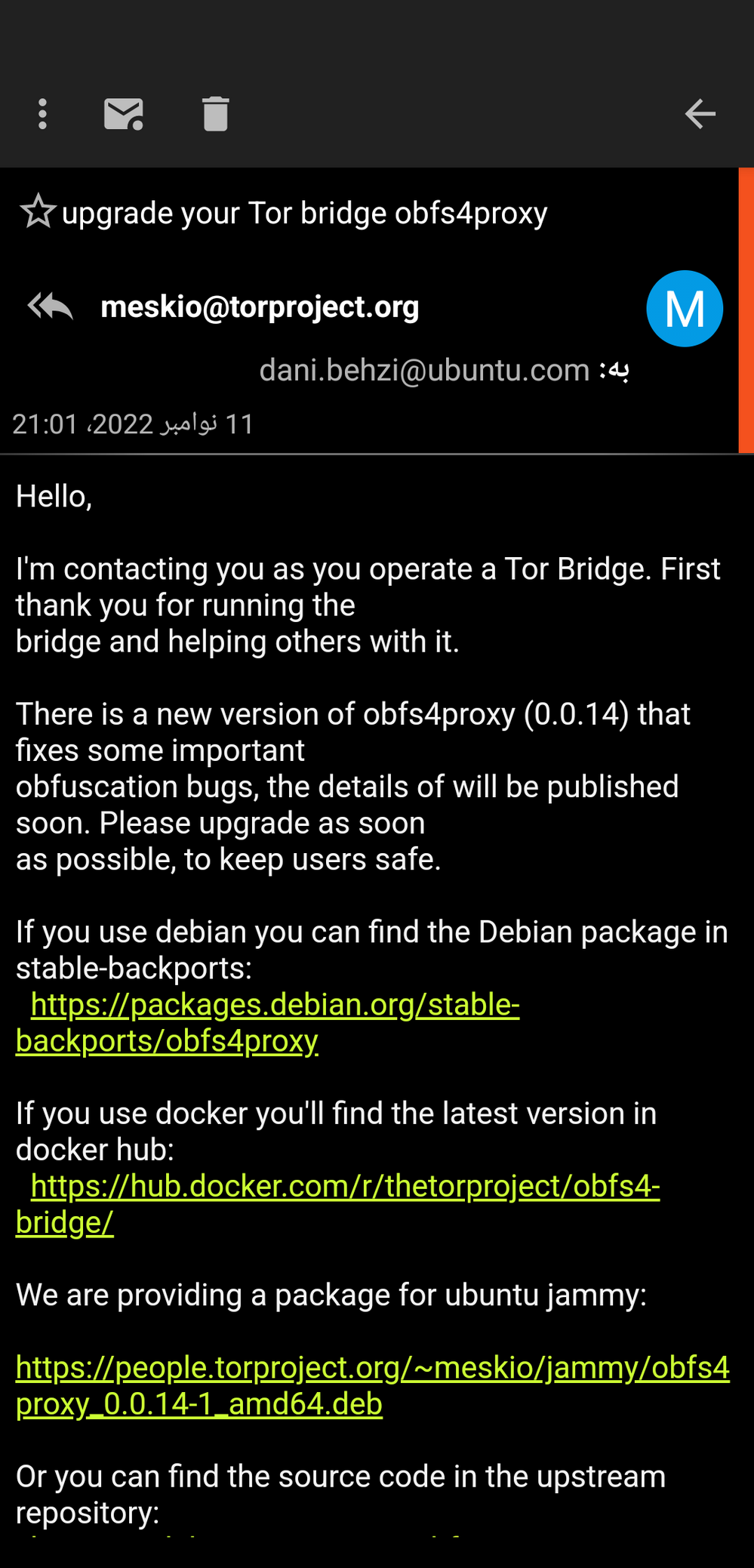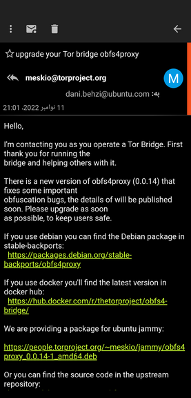 #تور همین الآن یه بهروز رسانی برای تقویت مبهمسازی پلهای obfs4 داد و از همهٔ اونهایی که پل میگردونن خواست که اعمالش کنن