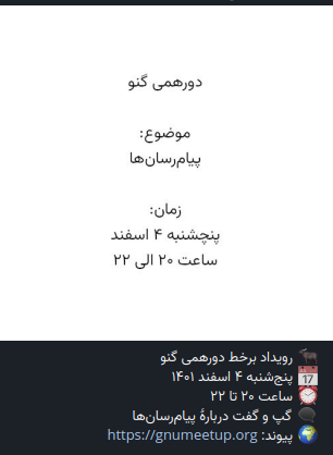 با تشکر از بچههایی که دورهمی گنو رو هماهنگ کردن. این لینک ویدیوی دورهمی در تاریخ ۴ اسفند هست.