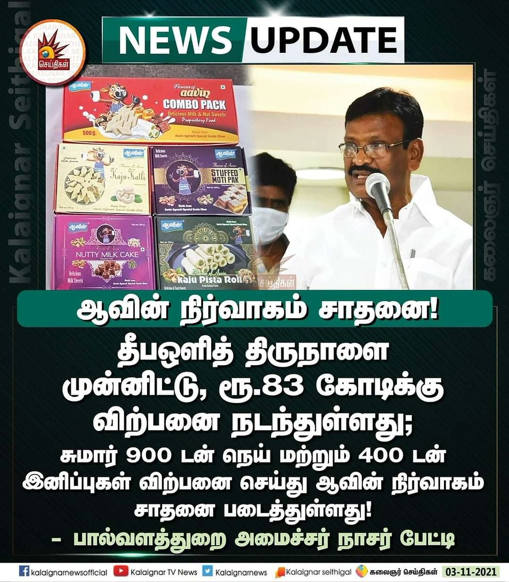 தீபஒளித் திருநாளை முன்னிட்டு, ரூ.83 கோடிக்கு விற்பனை நடந்துள்ளது; சுமார் 900 டன் நெய் மற்றும் 400 டன் இனிப்புகள் விற்பனை செய்து ஆவின் சாதனை படைத்துள்ளது! @CMOTamilnadu @arivalayam