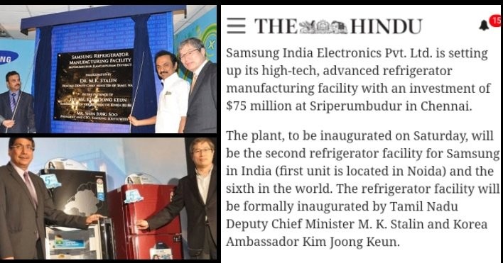 ஶ்ரீபெரும்புதூரில் 75 கோடி ரூபாய் முதலீட்டில் இந்தியாவின் இரண்டாவது சாம்சங் நவீன குளிர்சாதன பெட்டி உற்பத்தி தொழிற்சாலை #கலைஞர் ஆட்சியில் துணை முதல்வர் மு.க. ஸ்டாலின் அவர்களால் திறந்து வைக்கப்பட்டது. (27/11/2010)