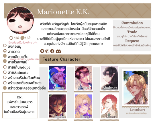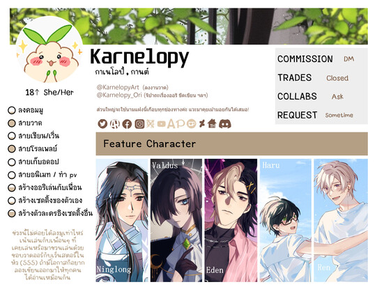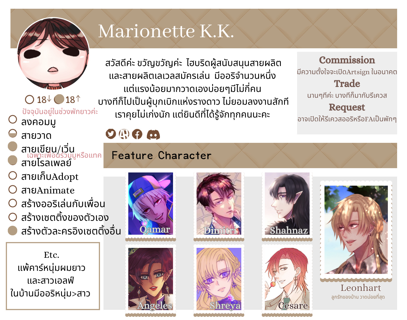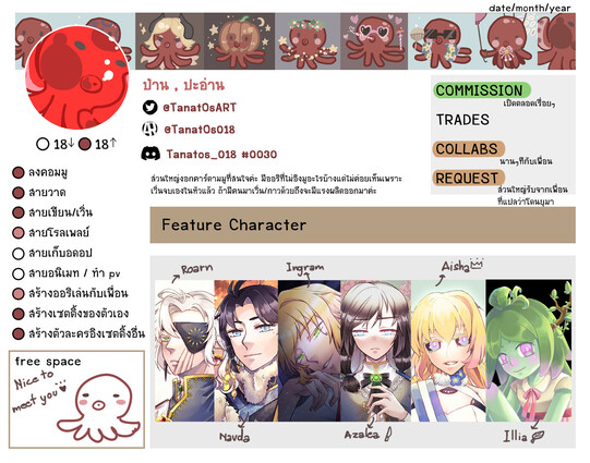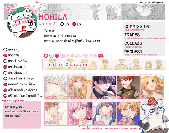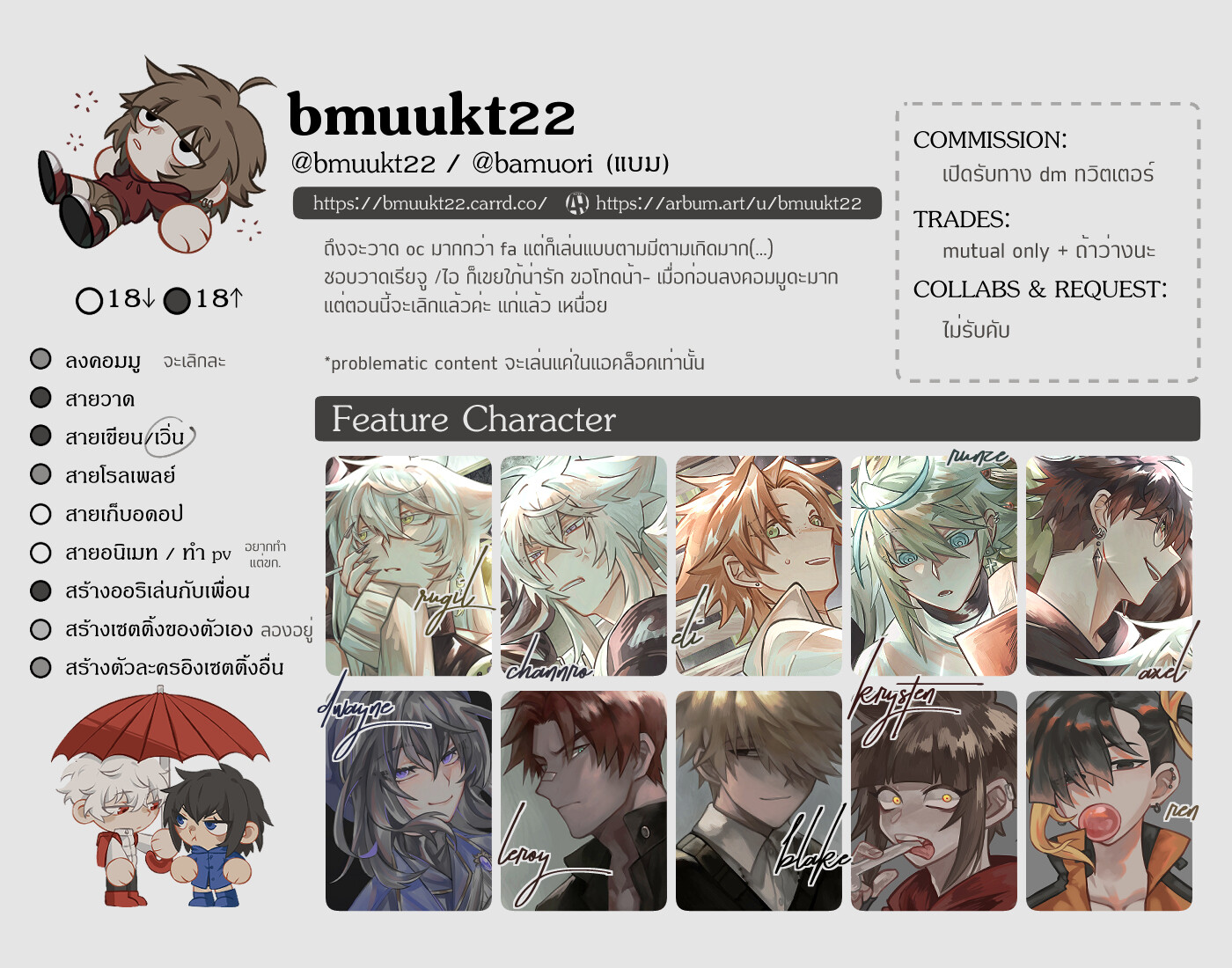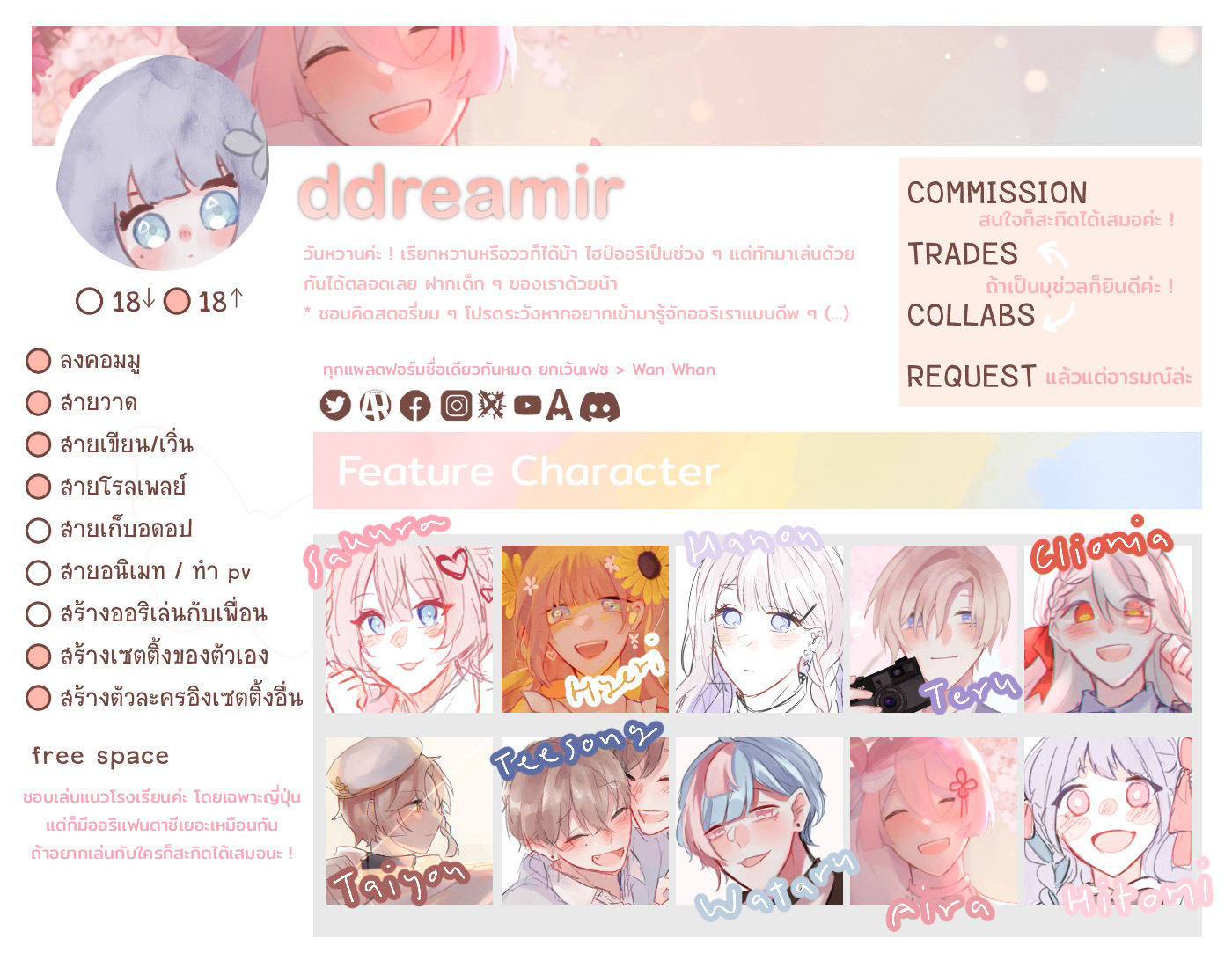เอาเทมเพลตอันนี้มาแปะในนี้ด้วย ปกติเป็นสายออริมากกว่าแฟนอาร์ตค่ะ ส่วนมากลงคอมมูเป็นหลักมีช่วงห่างหายเพื่อพักฟื้นเป็นระยะ