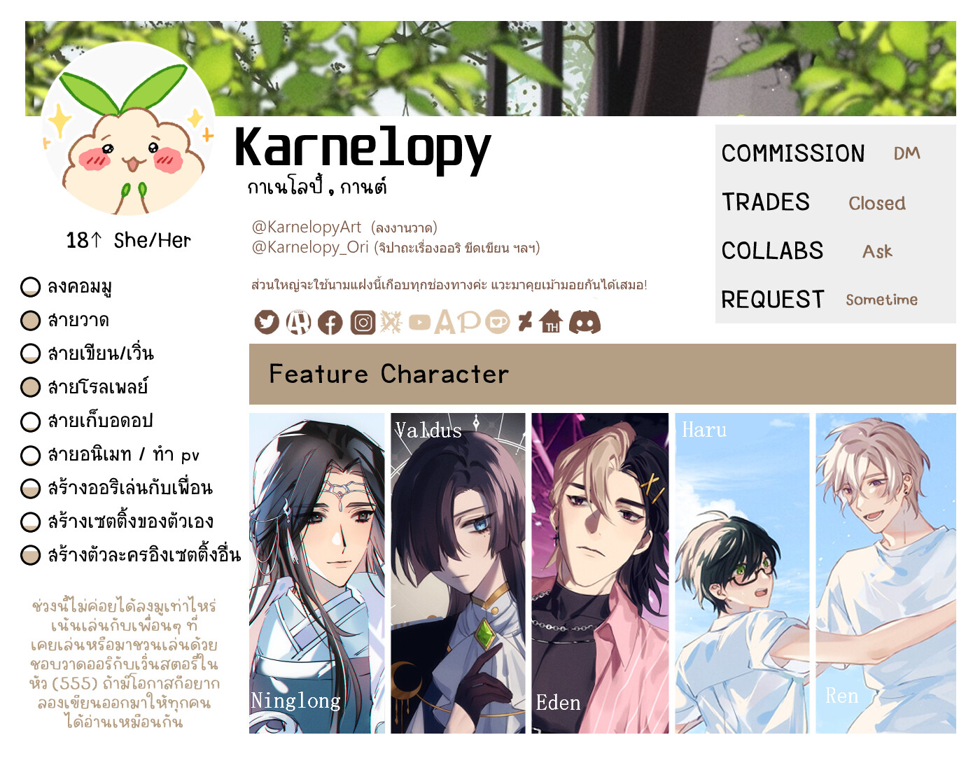ตอนนี้เลยพยายามเข็นเซ็ตติ้งออริออกมาสู่โลกภายนอกอยู่ล่ะค่ะ! เสร็จเมื่อไหร่ไม่รู้แต่ก็ขอฝากไว้ด้วยนะคะ!