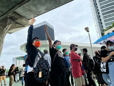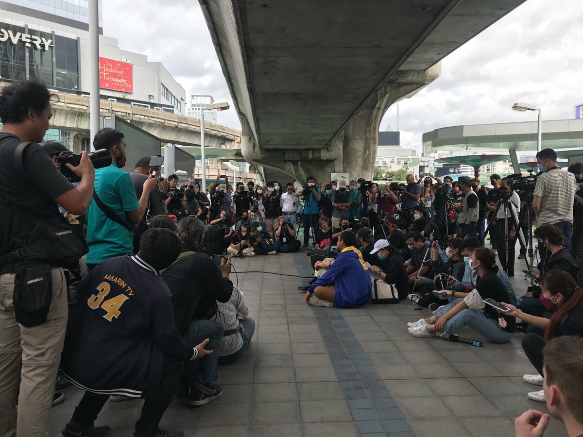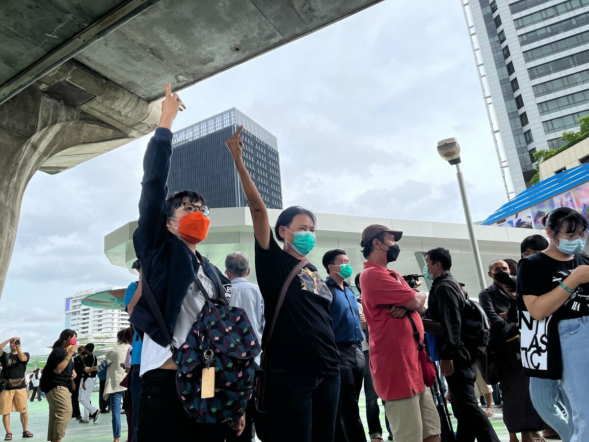 15.10 น. บรรยากาศประชาชนรอฟังคำตัดสินศาลรัฐธรรมนูญบริเวณสกายวอร์ค สี่แยกปทุมวัน