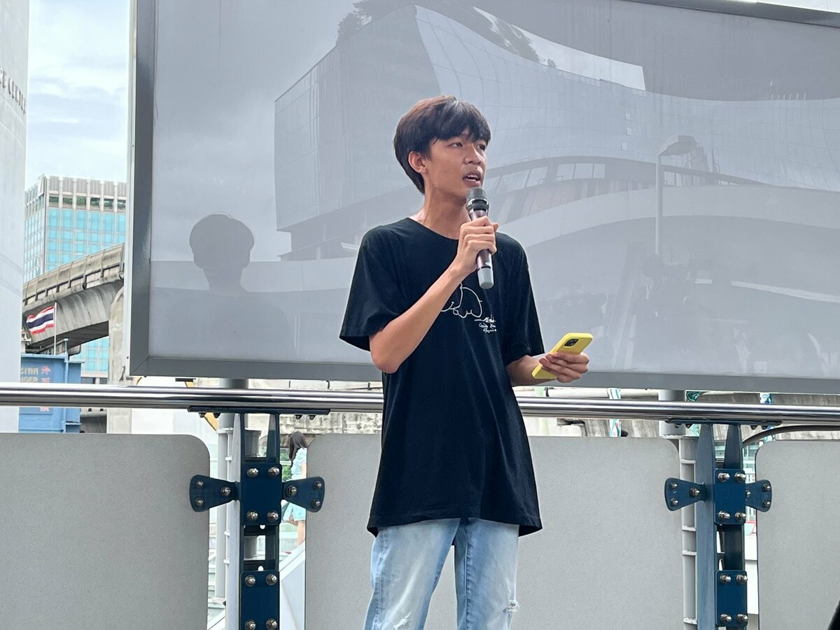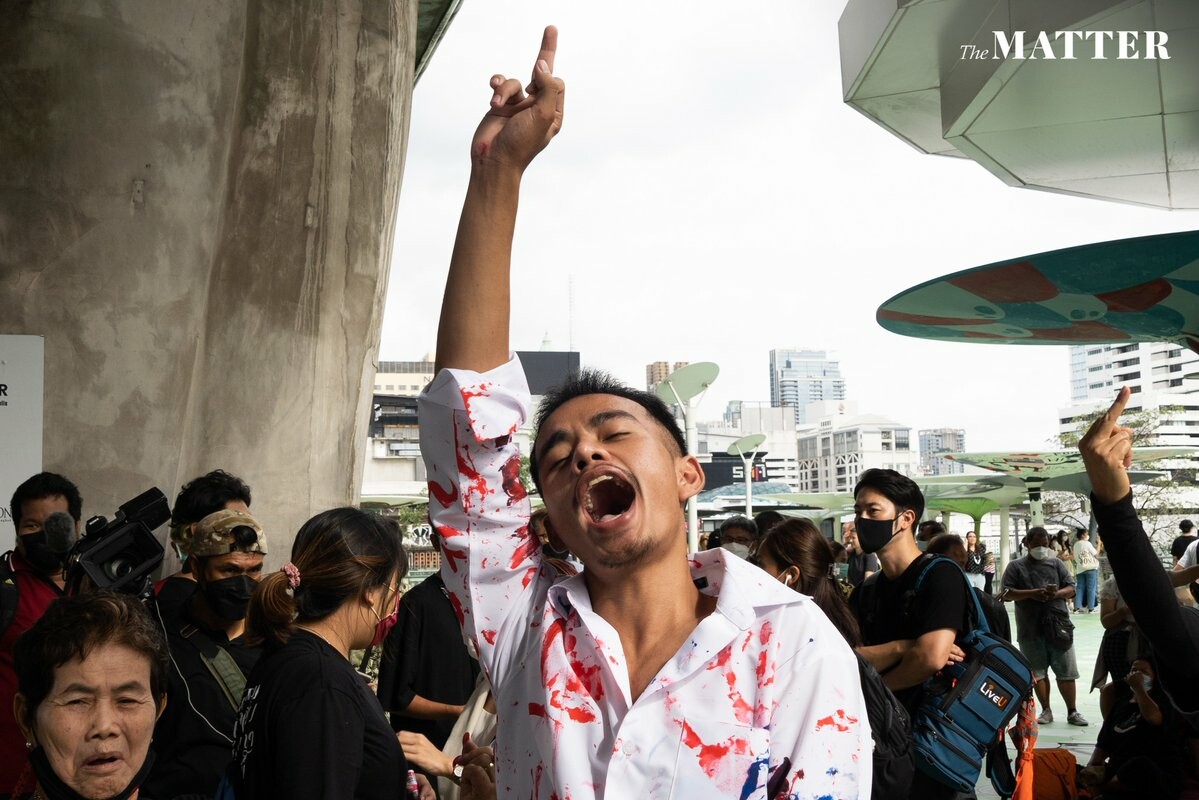 ตัวแทนมวลชนอ่านกวีของอานนท์ นำภา ที่เคยปราศรัยเอาไว้ ระหว่างรอการประกาศนัดหมายชุมนุมในวันพรุ่งนี้ต่อไป