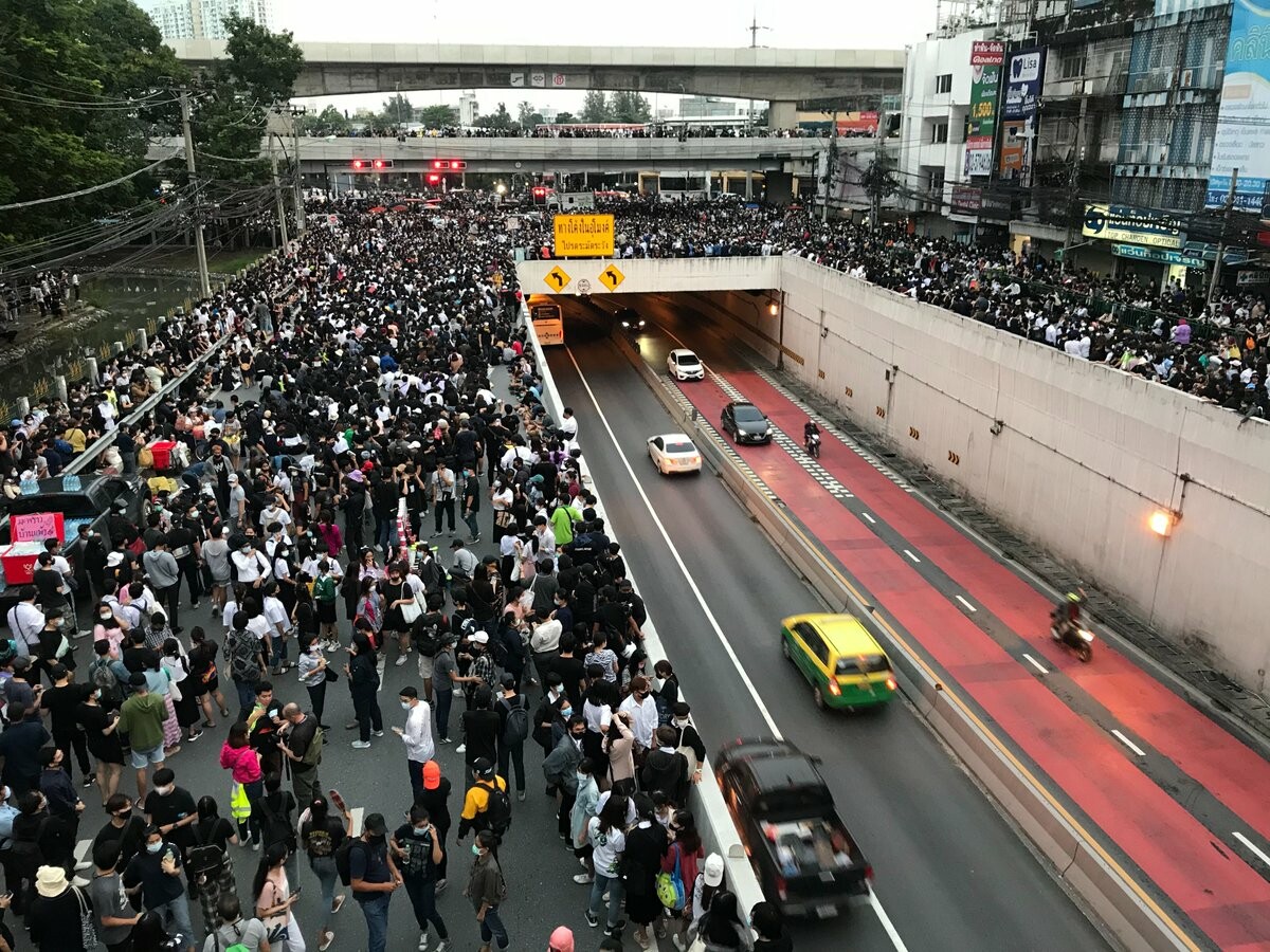 17.53 น. ภาพมุมสูงจากบริเวณการชุมนุมที่แยกเกษตร โดยการจราจรอุโมงค์ใต้แยกยังคงเป็นไปได้อย่างปกติ