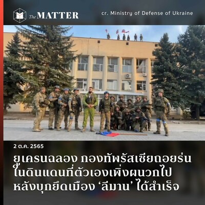 “กองกำลังรัสเซียแทบทั้งหมดที่ถูกส่งมาในลีมาน ถูกโยกย้ายกำลังได้สำเร็จแล้ว ถ้าไม่เข้าไปอยู่ในถุงเก็บศพ ก็กลายมาเป็นเชลยศึกของยูเครน” กระทรวงกลาโหมของยูเครนทวีตข้อความเฉลิมฉลอง หลังกองทัพยูเครนบุกยึดเมือง ‘ลีมาน’