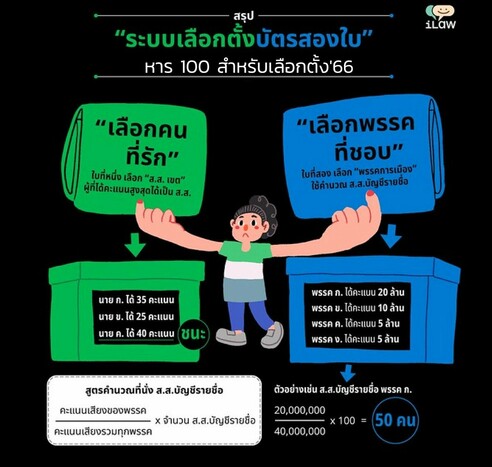ระบบการ #เลือกตั้ง66 จะใช้บัตรเลือกตั้งสองใบ และใช้สูตรหาร100 คล้ายระบบเลือกตั้งตามรัฐธรรมนูญ 2540