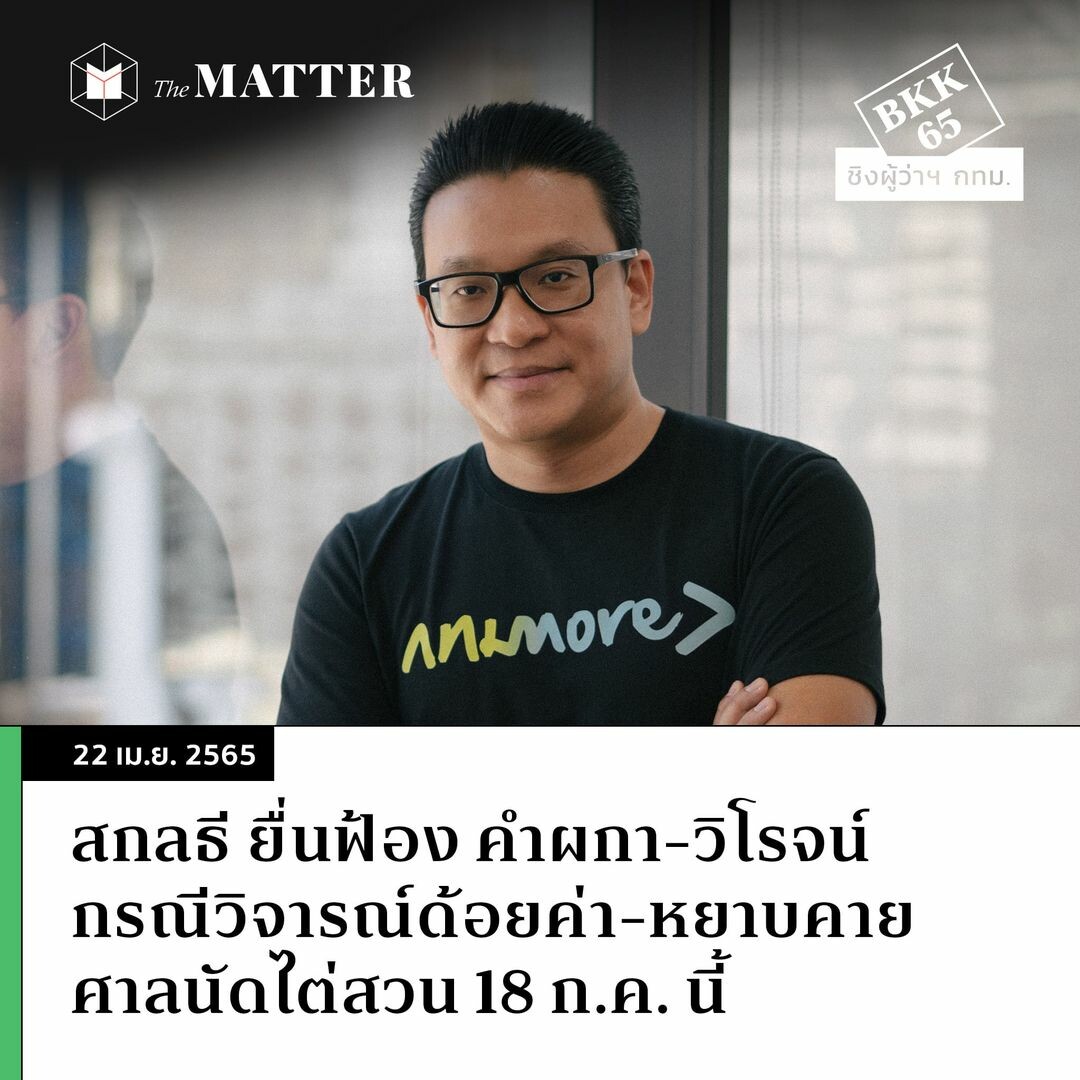 สกลธี ภัททิยกุล ผู้สมัครผู้ว่าฯ กทม. สังกัดอิสระ หมายเลข 3 ยื่นฟ้องลักขณา ปันวิชัย หรือ ‘คำผกา’ จำเลยที่ 1 และ วิโรจน์ อาลี จำเลยที่ 2 ฐานร่วมกันหมิ่นประมาทโดยการโฆษณา