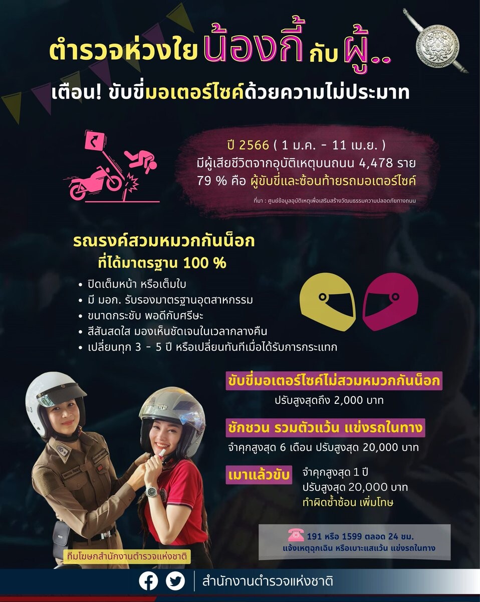 สำนักงานตำรวจแห่งชาติ เตือนผู้ขับขี่และคนซ้อนท้ายรถจักรยานยนต์ ให้สวมหมวกนิรภัยตามกฎหมายทุกครั้ง