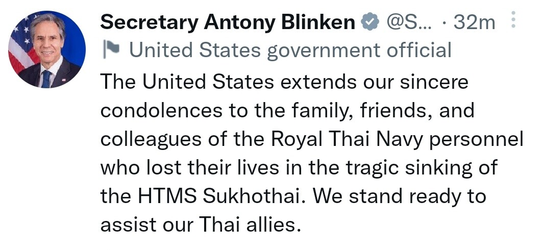 #US @SecBlinken has tweeted his condolences & offers assistance to #Thailand @prroyalthainavy for "tragic sinking of HTMS #Sukhothai" warship. The vessel sank on Dec 18 after giant waves slammed into corvette causing engine failure. 23 men still missing. 6 died. #เรือหลวงสุโขทัย https://twitter.com/SecBlinken/status/1605743688776196096