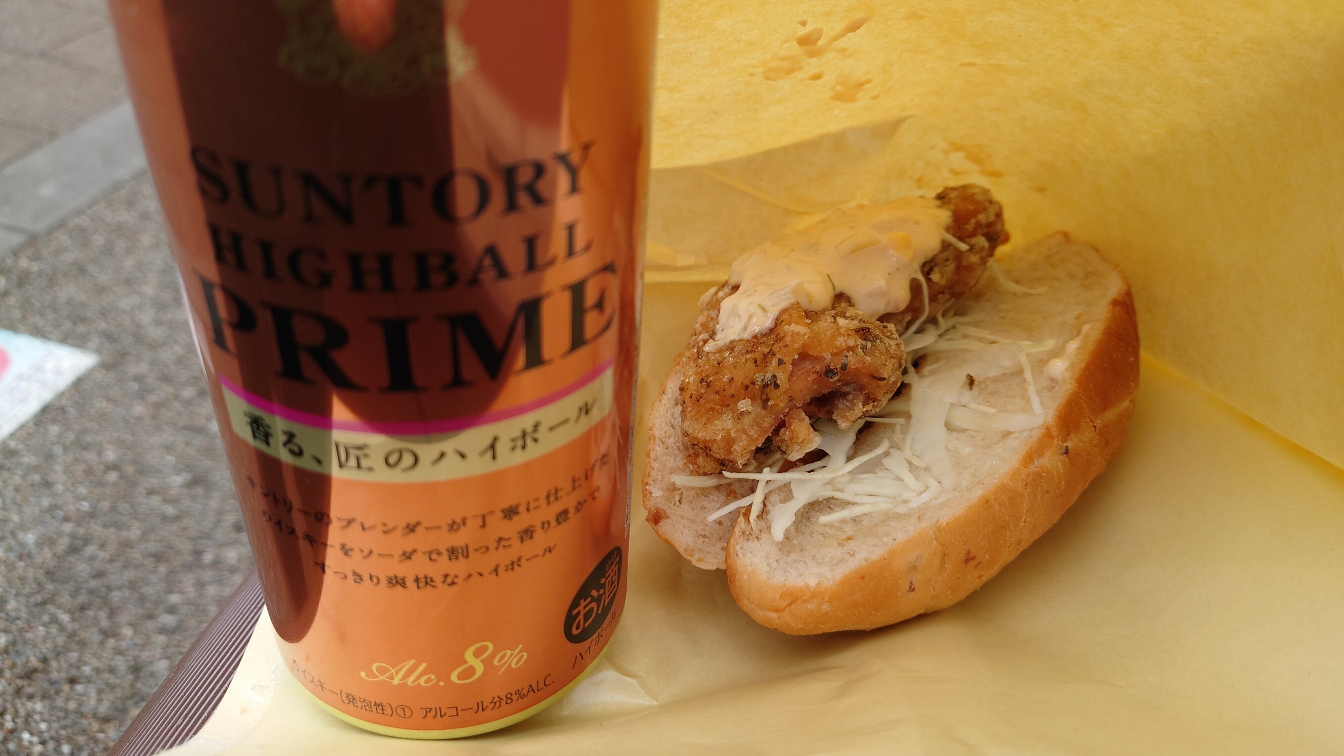 巣鴨店限定のさきあげチキンサンド、せっかくなので近くの公園でコンビニで買ったハイボールと共にいただきます。香草の効いたチキンとタルタルソースがマッチして「ざまああああ」ならぬ「うまあああああ」お酒も進む #さきあげ