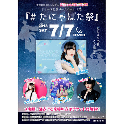 ・7日(土)は富山LEVEL3にて4thシングルのリリース記念パーティ。「アイドルとしての物語が始まった七夕の夜、あれから5年。 4thシングルのリリースを記念し、始まりの場所富山LEVEL3でリリースパーティーを開催!」という趣旨のイベントで、和装でお越しになるとドリンク代のみで入場できます #そらの閃光の果てに #出撃予告 #空野青空