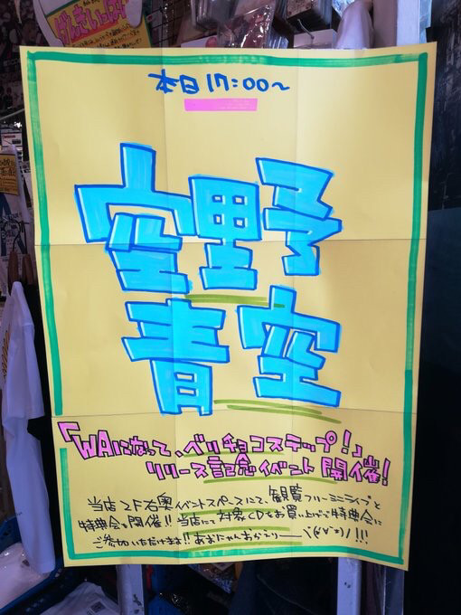 本日の戦場は、ヴィレッジヴァンガード名古屋中央店にて、4thシングルのリリイベ。前作「Beginning」振りとなり、店頭POPにも「おかえり」の文言が。