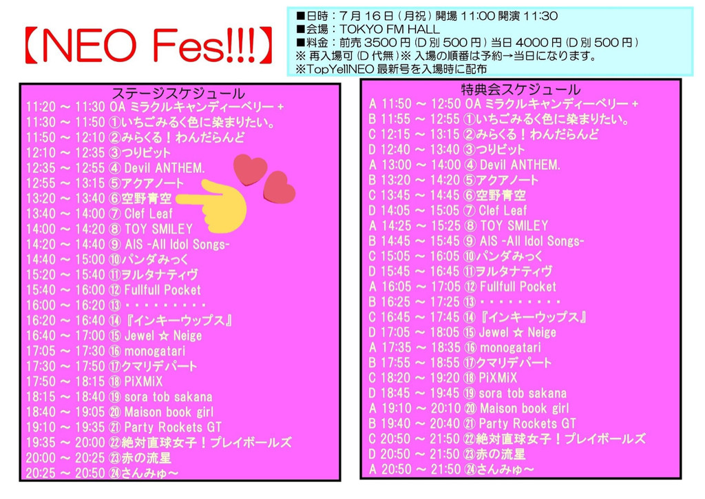 1)日付変わって本日16日は麹町TFMホールにて『NEO Fes!!! presented by Top Yell Vol.5』。つりビットさん・AISさんほか多数ご出演になる対バンイベントで、空野さんは1320-1340出撃、ターミナルは出番後1時間