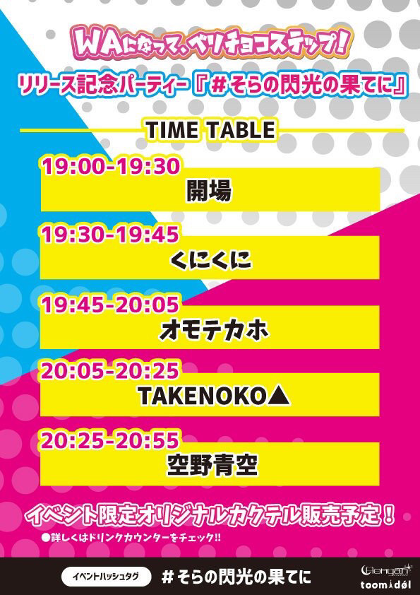 いよいよ明日に迫った『4th Single『WAになって、ベリチョコステップ!』Release party - #そらの閃光の果てに 』のタイムテーブルが公開となりました。渋谷nagomixにて7/19(木)1900開場です。