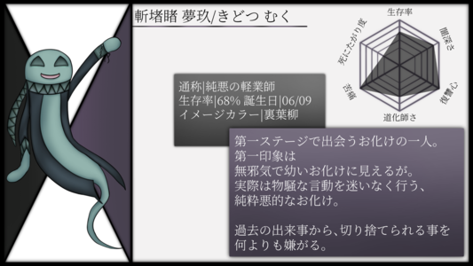 創作、たがマスに登場するお化け。斬堵睹 夢玖の簡単な紹介です。