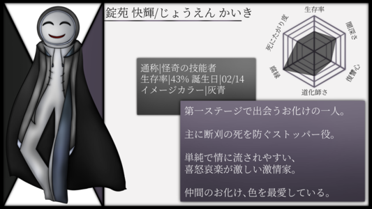 創作、たがマスに登場するお化け。錠苑 快輝の簡単な紹介です。