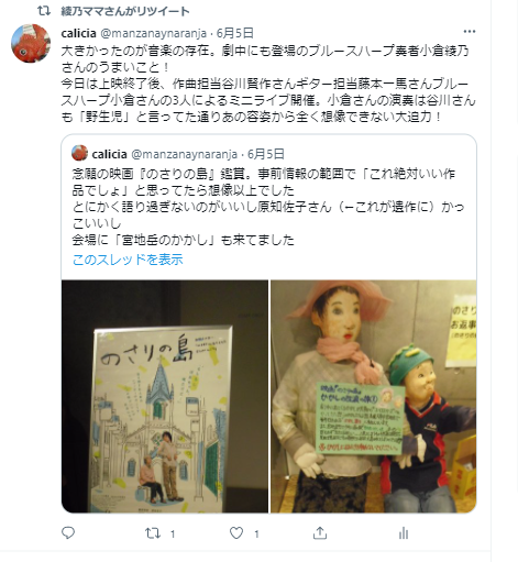 なんと!当方の投稿があの超絶かっこいいブルースハープ奏者小倉綾乃さんのお母様(ですよね)にRTされてる! #のさりの島