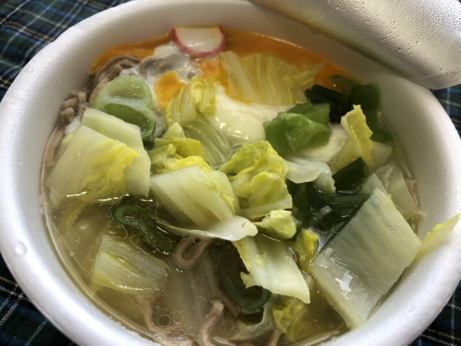玉子は上手く載せたはずなんだけど、お湯で温まるうちに開けた穴から卵黄が流れ出てしまいました。次回は最後に載せます。