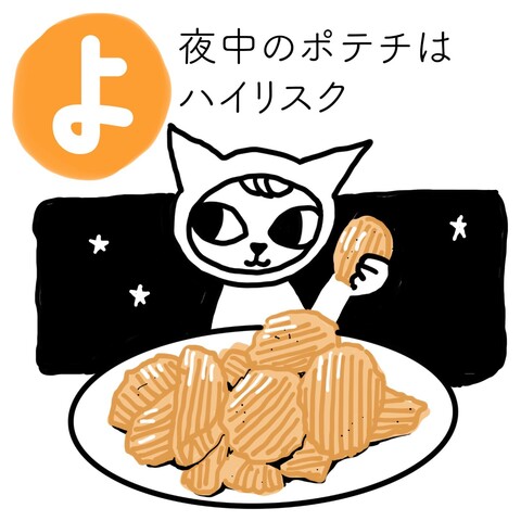 #猫かるた #猫イラストレーター #猫イラスト #イラスト好きな人と繋がりたい #猫の絵 #かるた #美味しい #食テロ #イラストエッセイ漫画 #illustration #猫の気持ち #ごはんイラスト #ポテチ好き #太る食べ物 #夜中のおやつ #ポテチ大好き #illustration #kaluta #karuta #hiraganawriting #cuteycat #japanese #kitten #catartwork