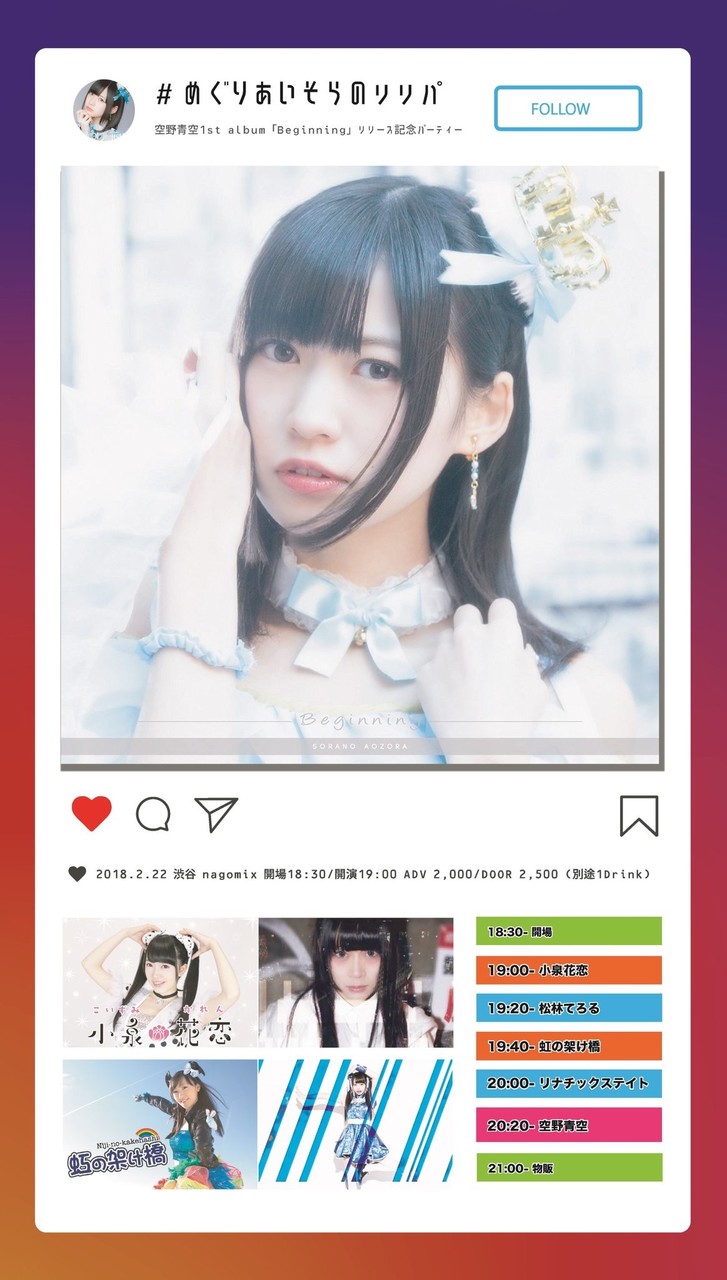 空野さん1stアルバム"Beginning"のリリースを記念して22日に開催される都内初主催イベント #めぐりあいそらのリリパ のタイムテーブルが公開されました。