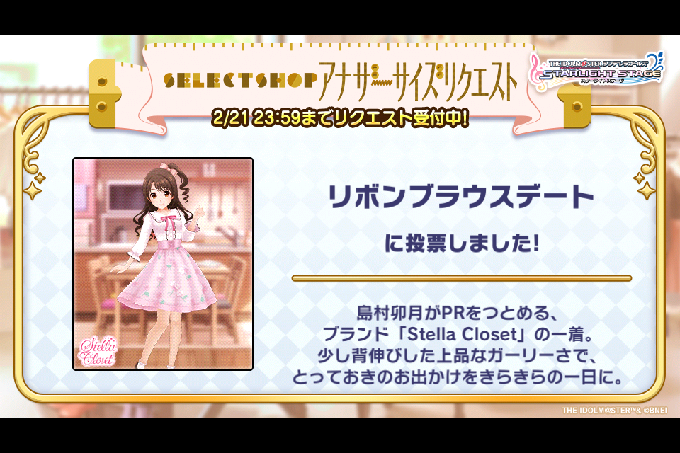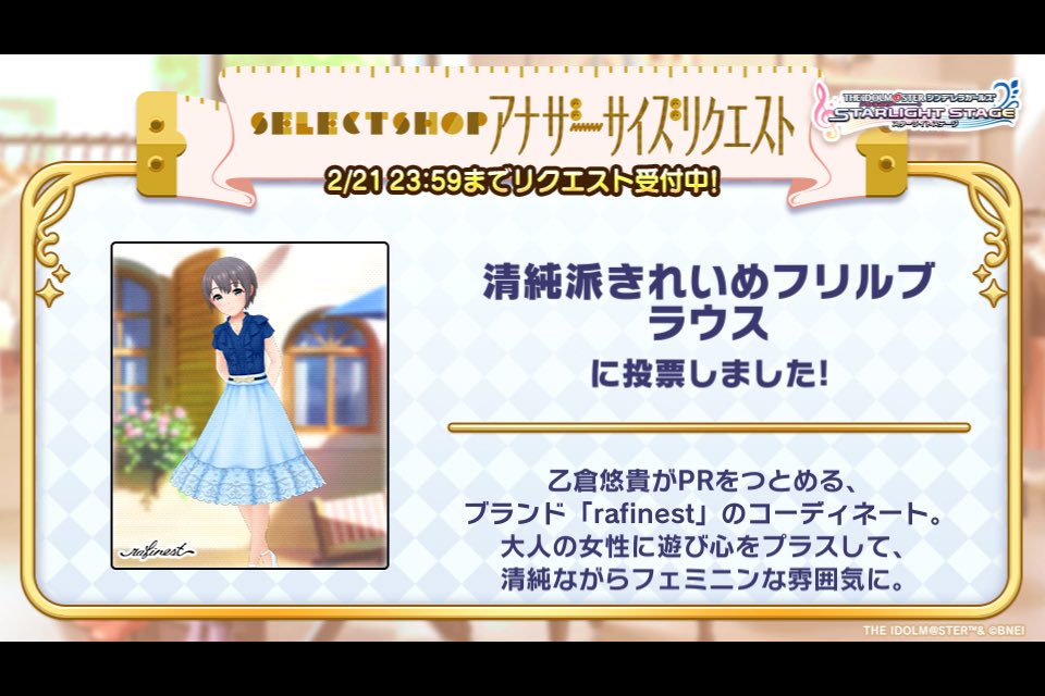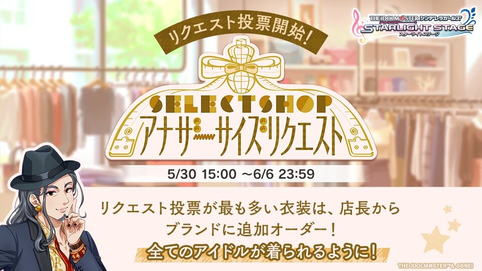 店長(CV:杉田智和)さんからお知らせがあった通り、「セレクトショップ #アナザーサイズリクエスト 」が近日開催予定です!