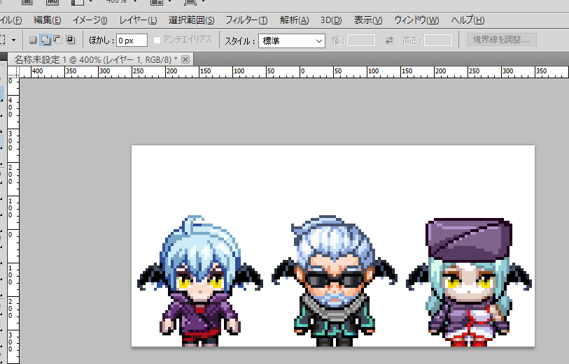 イーラ、ベール、マーモを作成中。こうやってジェネレータから出力したドット絵をベースに作るんだけど、なかなかジェネレータだけでは元のイメージに近づけないのでこれは結構手間かかりそう