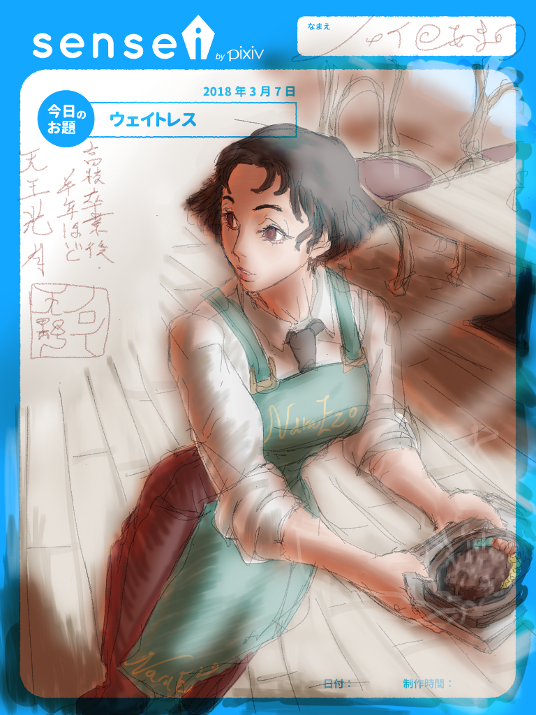 だいぶ以前「セーラー服」「ツインテール」などで描いた子なのですが、高校卒業後十月に警察学校へ入るまでの間ストーリー上行きつけになったレストランで半年フルタイムで働くことに、長かった髪は取り敢えず切ってほんのり整える程度の薄い化粧で働きます。