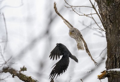 カラスに追われて必死に逃げるエゾフクロウ