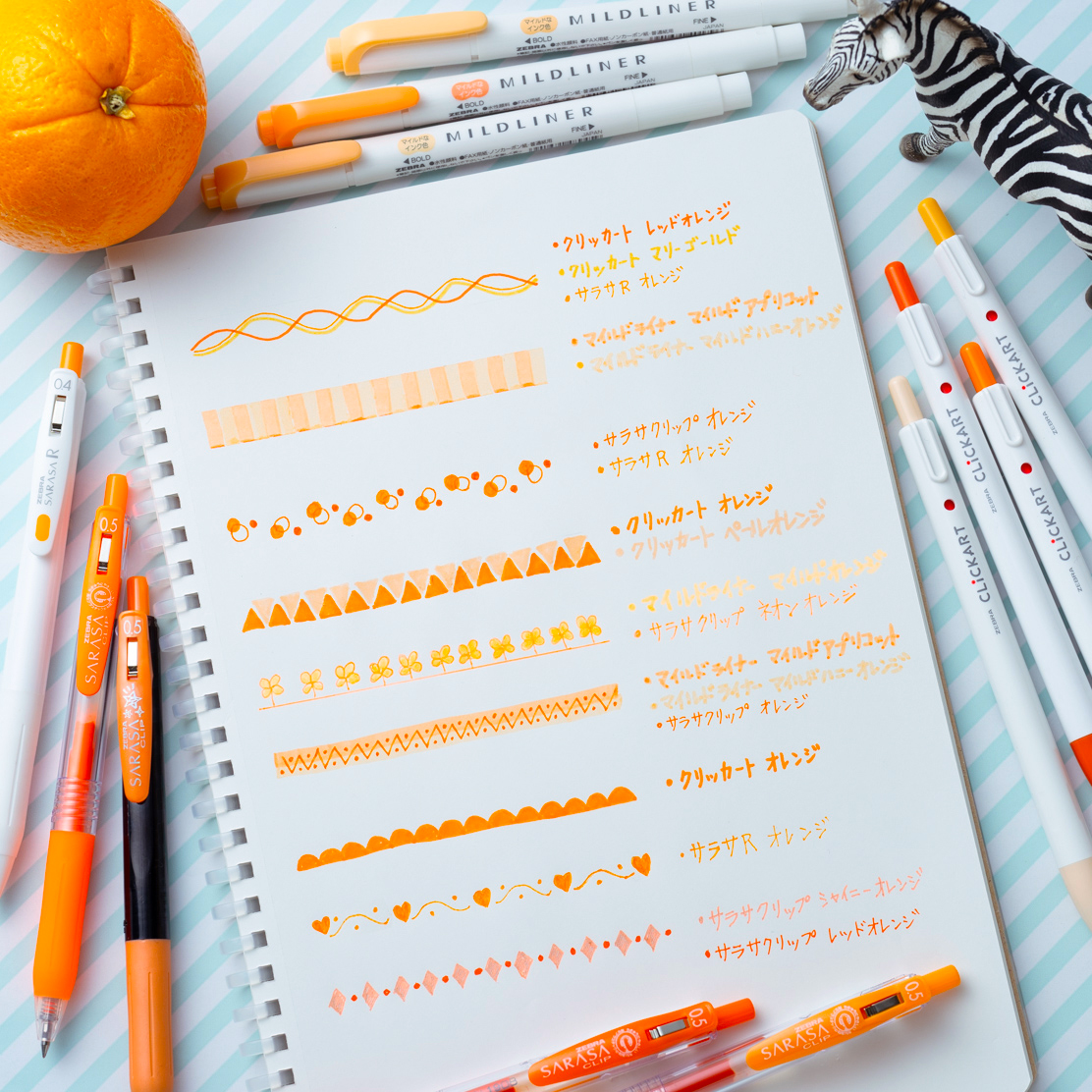 ゼブラにもいくつか新しい商品でオレンジ色のペンが増えたので、今回は色々なオレンジ色を組み合わせて飾り罫を描いてみました☺️