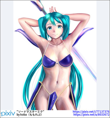 ソードマスターミク | koba(ももれぷ) #pixiv https://www.pixiv.net/artworks/77137376 #VOCALOID #初音ミク #ビキニアーマー #スリングショット #女戦士 #武器娘 #はいてない #グレートソード #筋肉娘