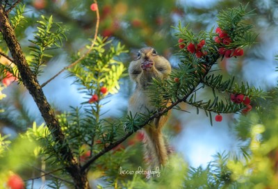 オンコ(イチイ) の実を頬張るエゾシマリス
