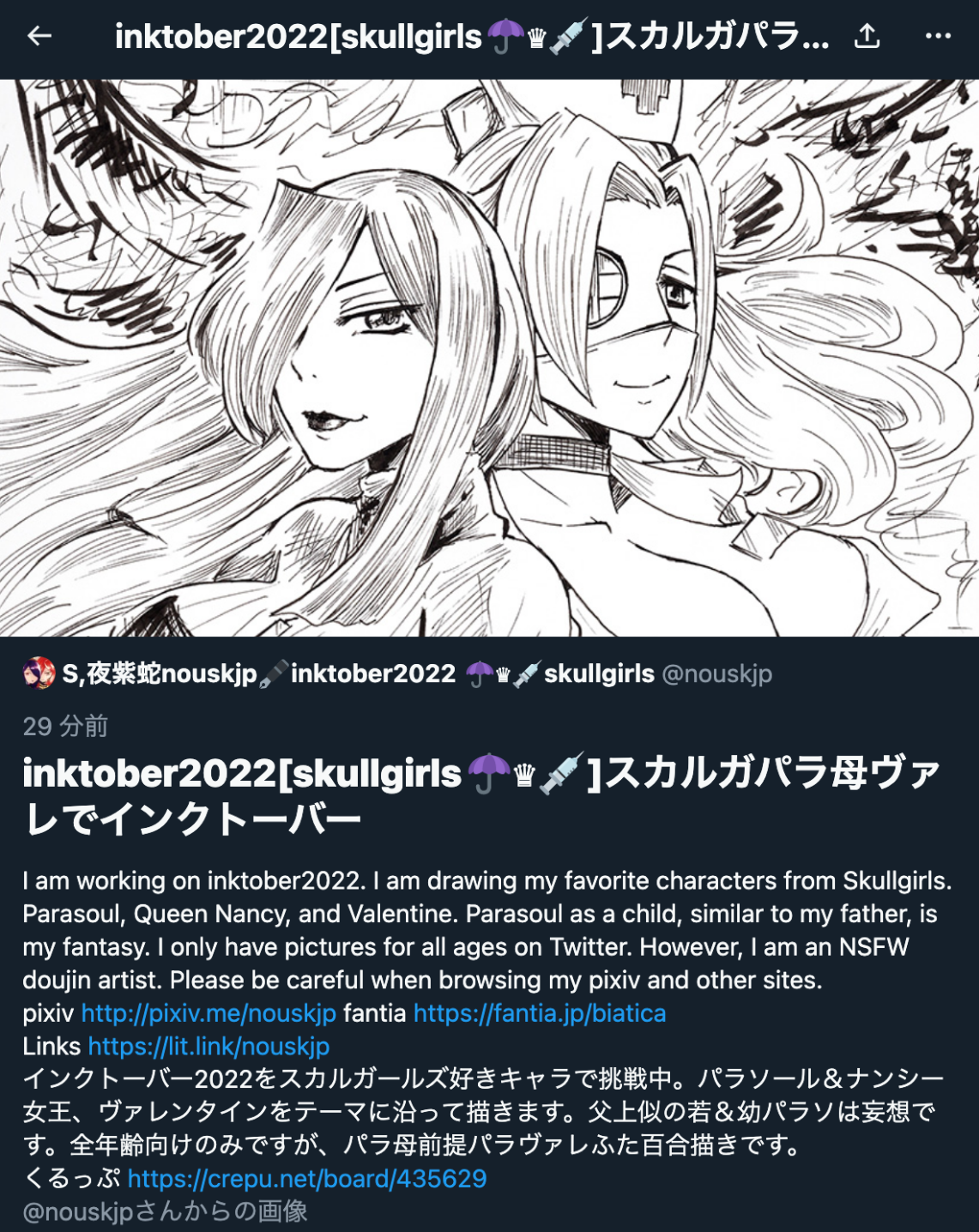 inktober2022モーメントのお知らせ&お色気要素封印でもシャドウバンになった件 https://crepu.net/post/463000#1 #twitter #シャドウバン #お知らせ #skullgirls