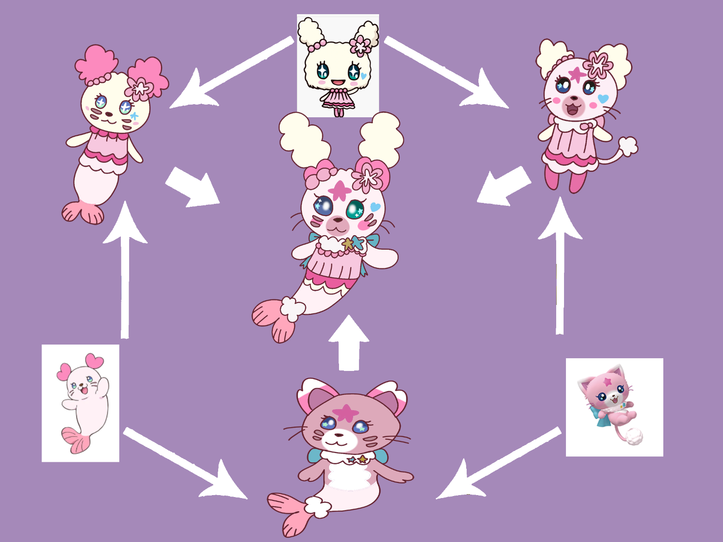 A Hexafusion Kawaii version of Meme. #トロピカル〜ジュプリキュア's Kururun, #戦士マジマジョピュアーズ's Mokonyan, and Lovelin from #Tamagotchi. 💖