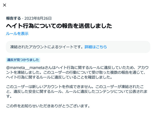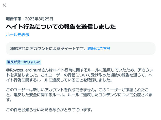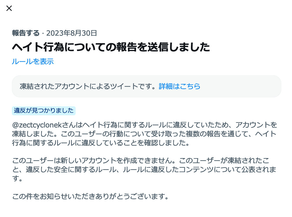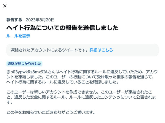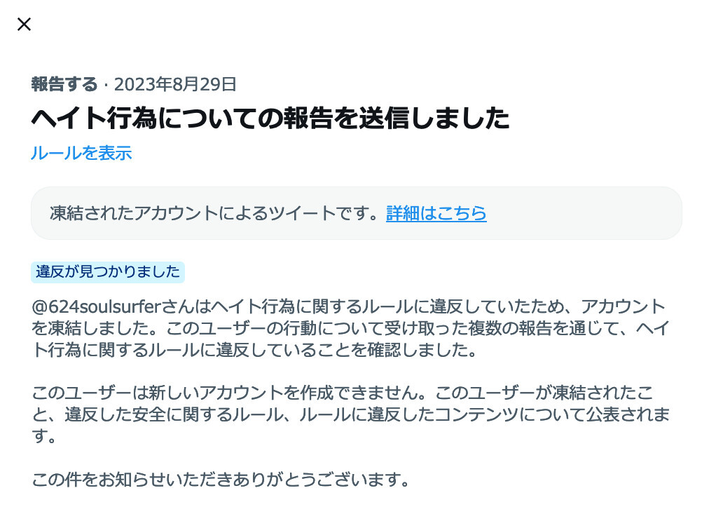 Twitterルール違反報告の結果通知ですぅ \(^o^)/