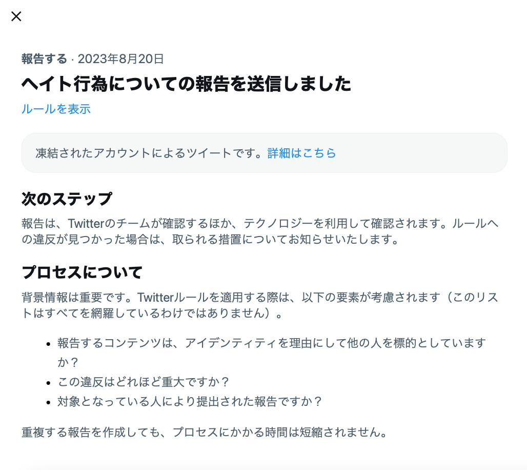 Twitterルール違反報告の結果通知ですよ〜 \(^o^)/