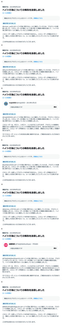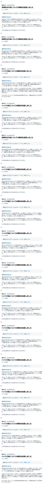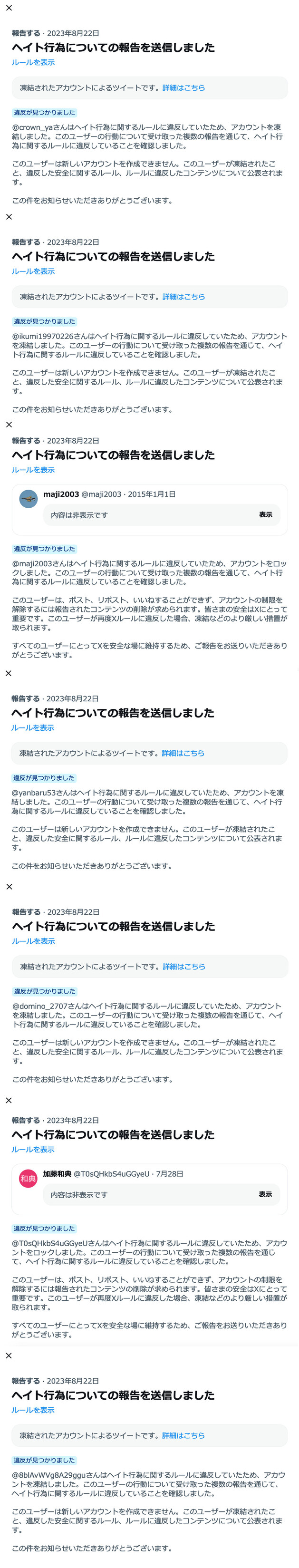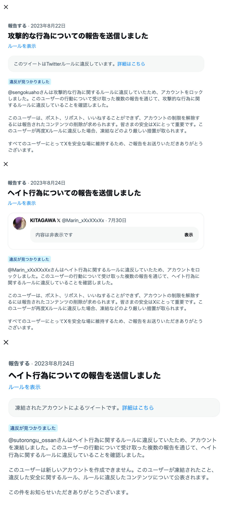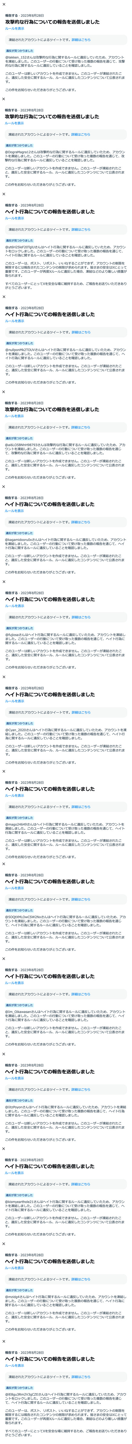 Twitter改めXの違反報告の結果通知が大量に届いていて、現在、ひぃこら繋げているところです😆