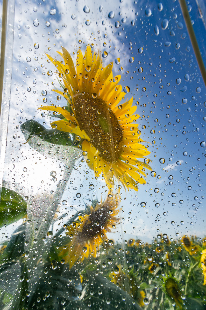ビニール傘越しのひまわり畑