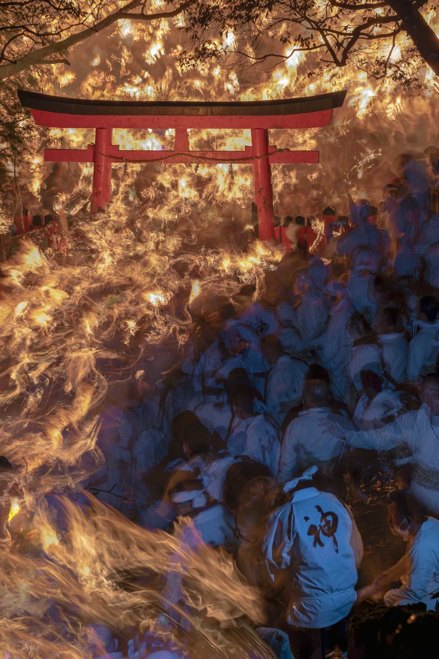 写真は聖域 神倉山 神倉神社のゴトビキ岩にある鳥居 炎に包まれる聖域、お灯祭りの風景を新たな方法で再現像、表現してみました。