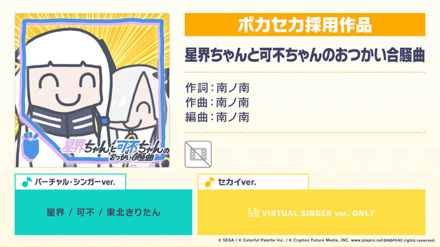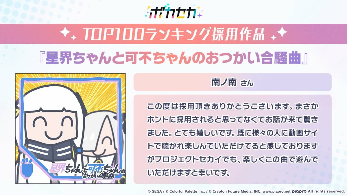 TOP100ランキングの採用楽曲は南ノ南さんの作品 「星界ちゃんと可不ちゃんのおつかい合騒曲」です🎉